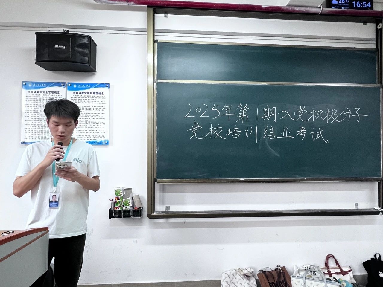 考试前,现场工作人员有条不紊地引导考生进行签到,他们逐一核对考生信息,随后指引大家有序就座,这确保了考场秩序井然。学生党支部工作人员郑晓林为全体入党积极分子强调考试纪律以及相关注意事项,确保本次考试顺利进行。