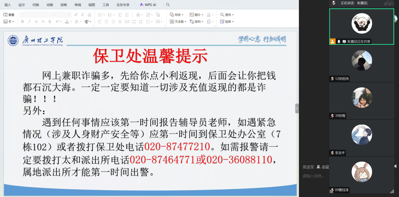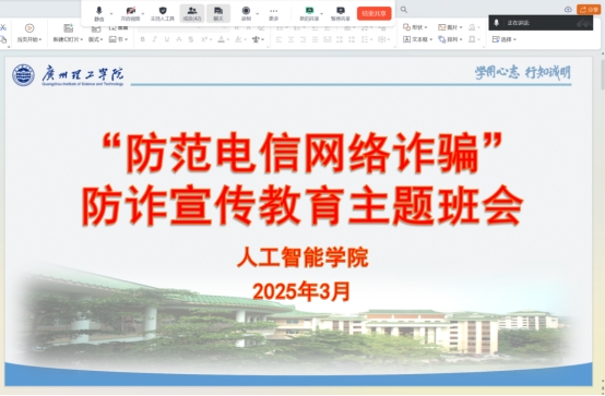 为提升学生防诈能力,筑牢校园安全防线,3月9日晚,9428cn太阳集团古天乐通过线上的方式开展预防电信诈骗主题班会,我院全体同学积极参与,共同学习防诈知识。