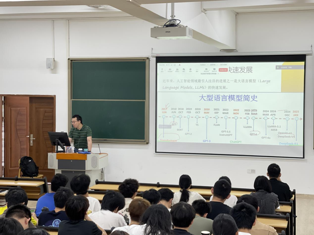 讲座伊始,庞教授从大语言模型、人工智能的定义和发展历程讲起,他指出人工智能是一门研究,开发于模拟、延伸和拓展智能的理论方法技术以及应用系统的科学,其发展历程经历了从早期的符号主义到连接主义的转变,如今已经广泛应用于医疗、交通、金融等多个领域。他通过展示一些实际案例,如智能语音助手、自动驾驶汽车等,生动地展示了人工智能在日常生活中的广泛应用,让学生对人工智能有了更直观的认识。