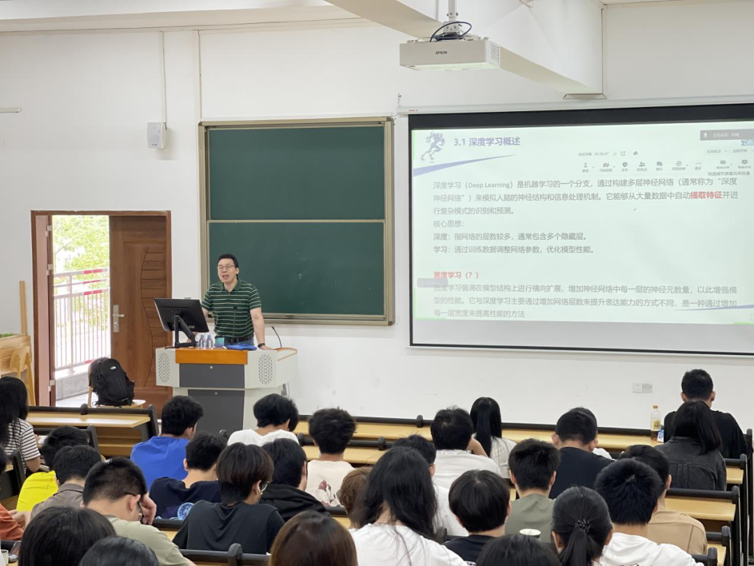 5月30日,9428cn太阳集团古天乐特邀华南师范大学的庞雄文教授为24级大数据专业新生开展“人工智能”专题讲座。庞雄文教授是华南师范大学硕士生导师,博士研究生,主要研究领域为时序数据处理和图像处理,其研究成果获《IET COMPUTER VISION》《SENSOR》《Cluster Computing》《计算机科学》和《华南师范大学学报》等国内外核心期刊收录,所在团队入选省级科研和教学团队。截至2025年,持续在机器学习与数据挖掘领域开展深度研究。