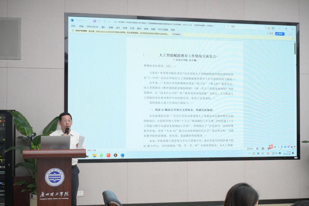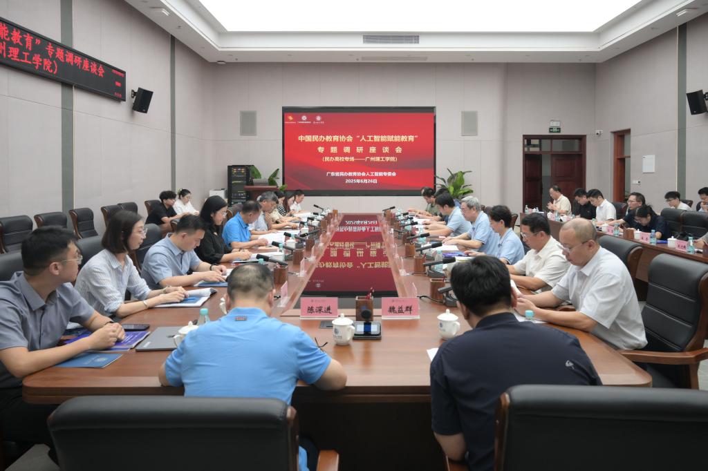 (庞晓晓)6月26日,中国民办教育协会“人工智能赋能教育情况”专题调研座谈会民办高校专场在广州理工学院工程楼一楼会议室顺利召开。中国民办教育协会调研组成员、广东省民办教育协会领导、广东省民办高校代表等41位代表参会,广东民办教育协会秘书长朱祖胜主持会议,本次会议聚焦民办高等教育人工智能实施进展,汇聚行业力量共探发展路径。