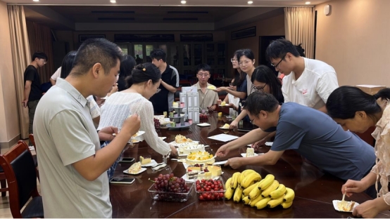 活动现场处处洋溢着温馨气息:长桌上整齐摆放着品类丰富的新鲜水果,搭配着奶油细腻的定制蛋糕,形成一幅诱人的画面。当《生日快乐》的旋律缓缓流淌,在场教职工不约而同地轻声跟唱,寿星们在摇曳的烛光中闭眼许愿,温馨场景感染着每一个人。