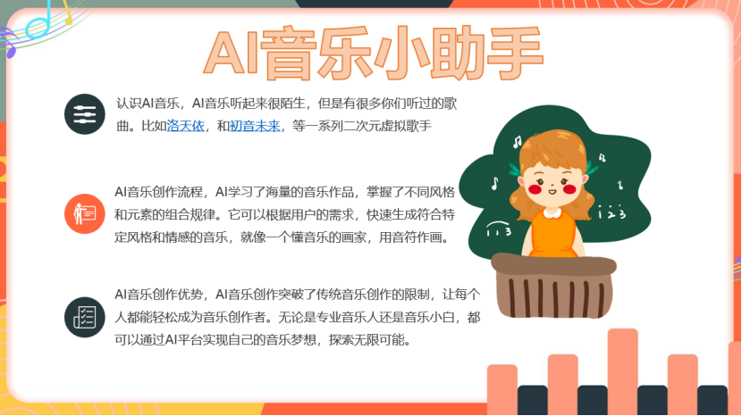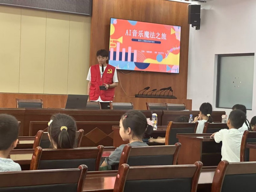 “哇!我‘写’的歌被放出来了!”第七节课,队员黄普星带领孩子们踏入了AI音乐的奇幻殿堂。课程伊始,一段由AI生成的美妙旋律瞬间抓住了所有孩子的耳朵。队员深入浅出地讲解了AI如何学习海量音乐数据,理解旋律、节奏、情感,并最终进行创作。