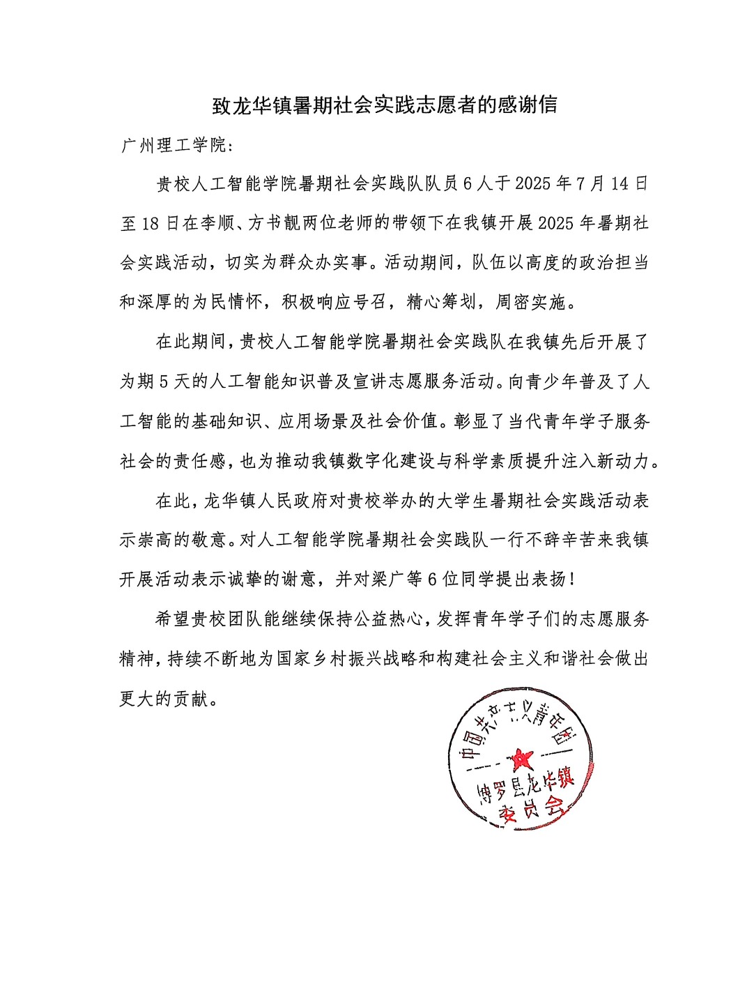 近日,我院欣喜收到了来自龙华镇政府的感谢信。信中,镇政府对于我院赴该镇开展大学生志愿者暑期实践活动的师生队伍,给予了高度评价和诚挚感谢。这份来自基层政府的认可,是对我院实践育人工作成效的有力肯定,也是对师生队伍辛勤付出的最佳褒奖。