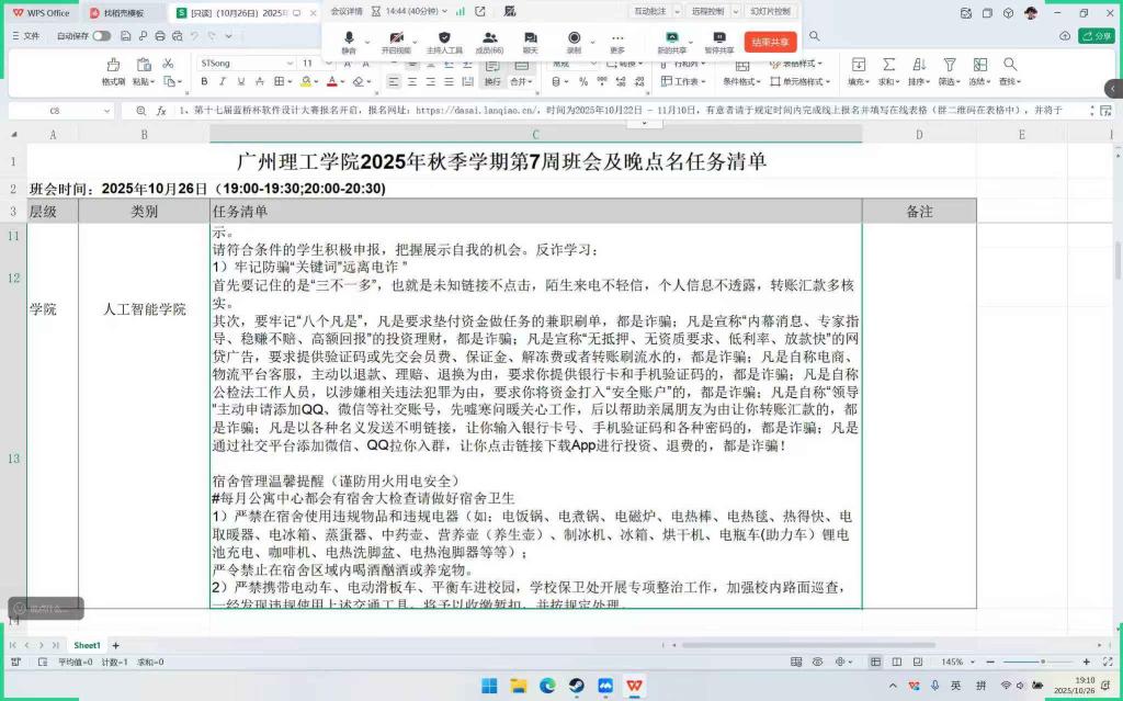 为明确工作重点、传达重要通知并强化学生安全意识,10月26日,各班开展了第七周班会,涵盖学科竞赛、反诈学习、宿舍管理等多项内容。