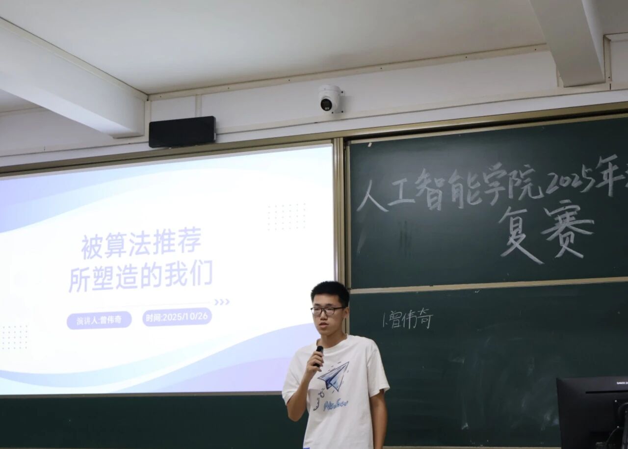 10月26日,广州校区6栋203迎来了备受关注的复赛,“被算法推荐所塑造的我们”这一主题将比赛推向了更深度的思辨层面。当选手们站在复赛的舞台上,他们带着初赛积累的经验与自信,以更饱满的热情投入到演讲中。3—7分钟的限定主题演讲,不仅要脱稿展现,还需借助PPT展示深度思考。