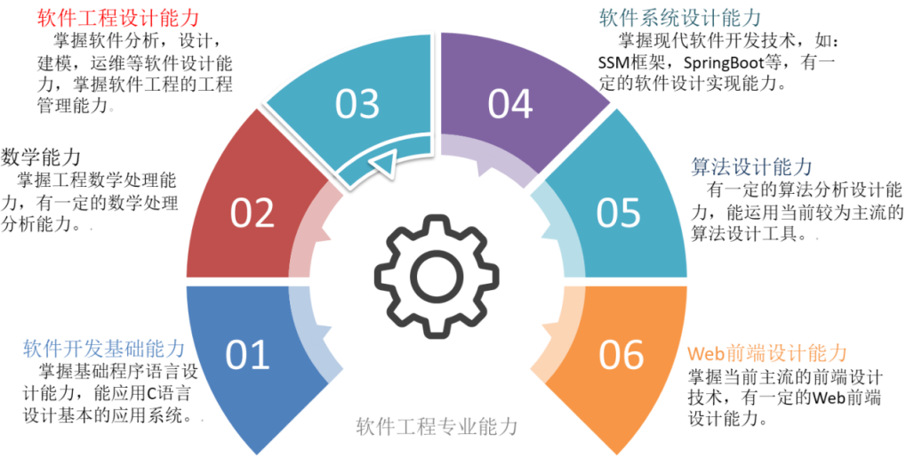 软件工程专业以培养应用型软件人才为目标,以现代软件开发技术为着力点,将当下较为前沿的软件开发技术,如Java Web开发技术、SpirngBoot框架开发、SpringCloud框架开发,Vue.js前端开发等技术有序的融入进课程体系;软件工程专业经过几年的发展建设以形成企业计算、智能计算、工业软件3个专业方向;其中企业计算方向,面向企业级软件开发前沿,让学生掌握了解企业级现代前沿技术,如大数据开发技术,数据分析等;智能计算方向,面向各类人工智能应用开发,如图形图像检测开发,自然语言处理开发等 。