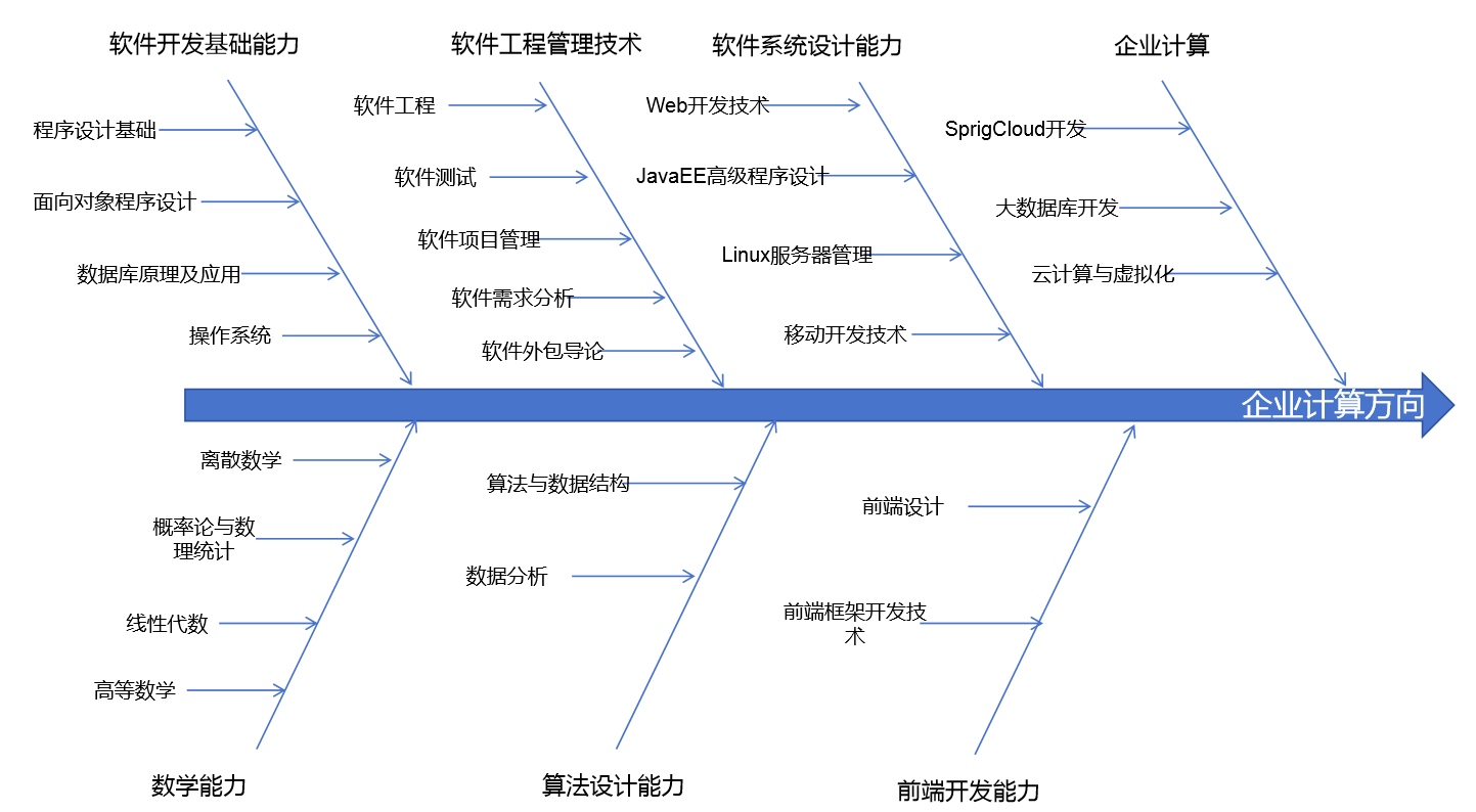 专业能力、专业方向最终落脚点都在课程上,软件工程专业课程体系以能力和专业方向为线索,将软件工程课程穿插其中,构建起完善的课程体系,实现课程对专业能力支撑,课程对专业方向支撑。 企业计算、智能计算、工业软件方向课程体系结构如图2、图3、图4所示。
