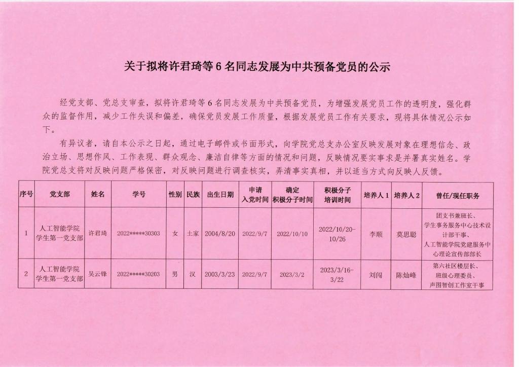 关于拟将许君琦等6名同志转为中共预备党员的公示