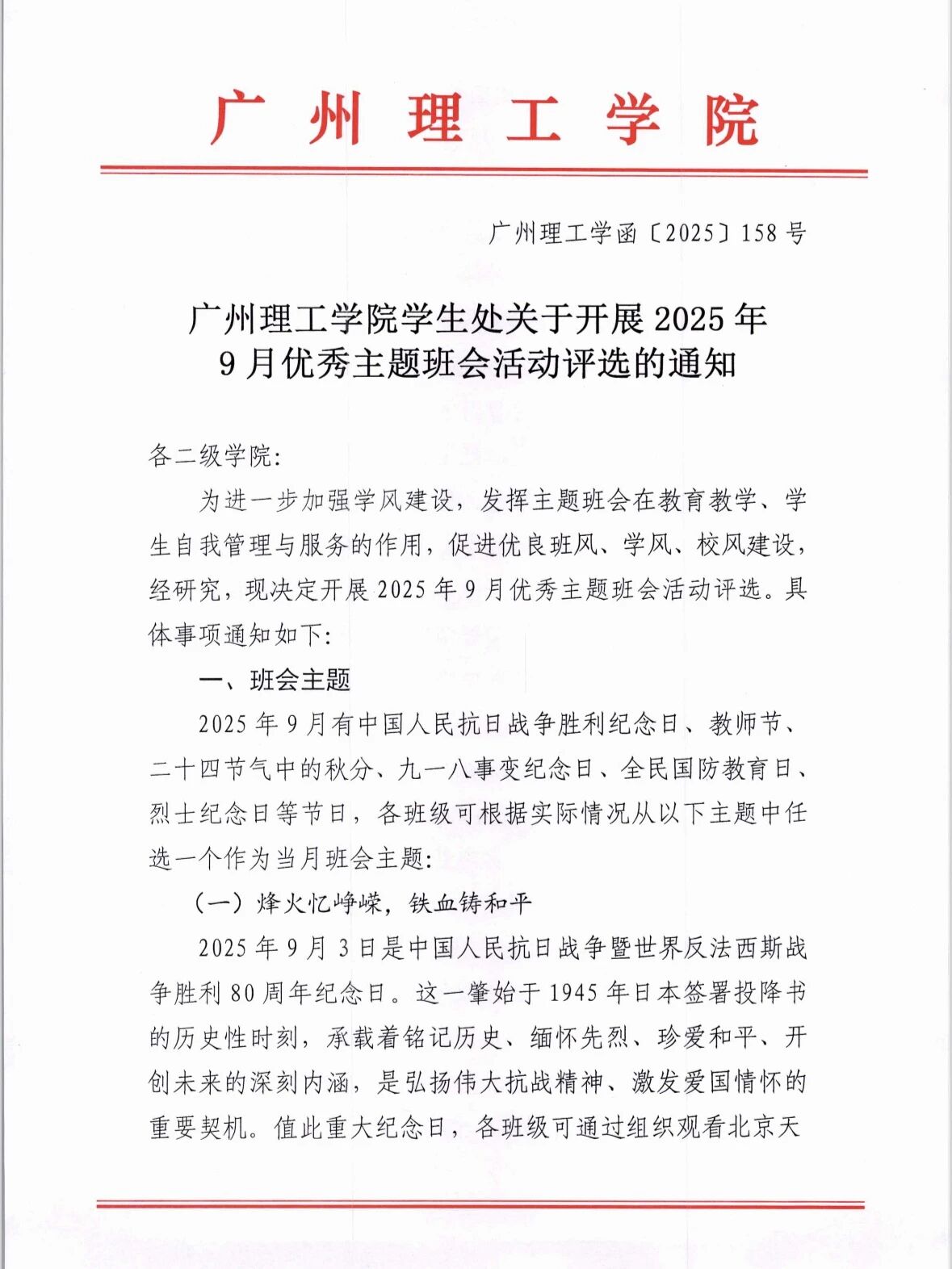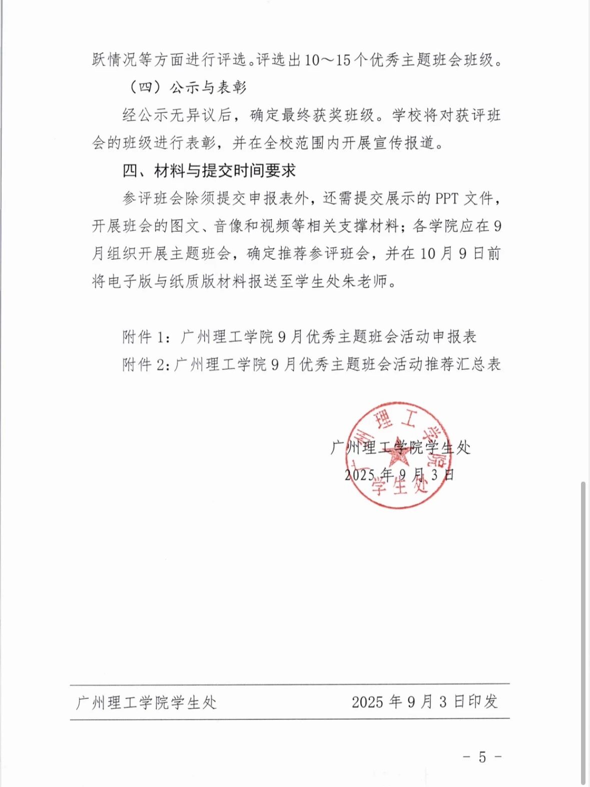 广州理工学院学生处关于开展2025年9月优秀主题班会活动评选的通知